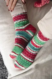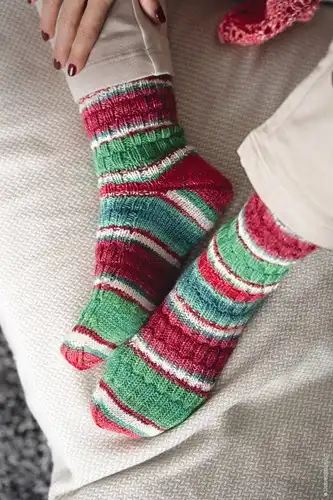 Также в этой новогодней серии добавлена ниточка люрекса. На готовом изделии он смотрится, как будто носочки припорошило снегом, красиво поблескивает и придает нотку гламура.