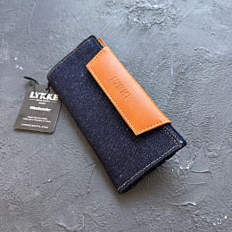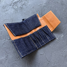 Чехол выполнен из темно-синей джинсовой ткани с кожаными элементами цвета виски или шоколад. Закрывается на клапан с магнитом.