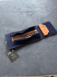 Чехол выполнен из темно-синей джинсовой ткани с кожаными элементами цвета виски или шоколад.