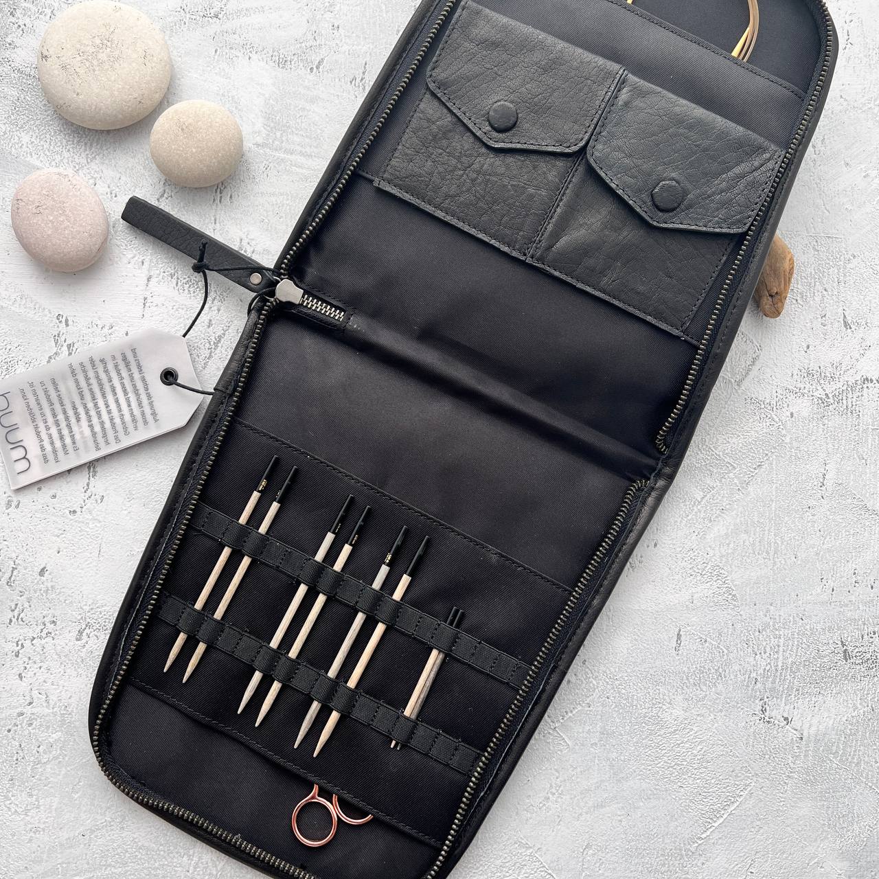 Аккуратный чехол на молнии оснащен карманами на кнопках и отделениями, позволяющими аккуратно хранить спицы и мелкие аксессуары. Благодаря плоской конструкции, он легко помещается в сумку и идеально подходит для путешествий.