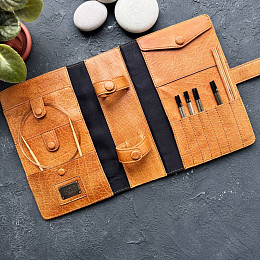 Органайзер изготовлен из высококачественной кожи и представляет собой незаменимую вещь для тех, кто хочет, чтобы спицы и другие аксессуары для вязания были аккуратно разложены и систематизированы.