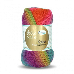 Название говорит само за себя: это разноцветная пряжа с яркими цветовыми переходам, она подойдет для вязания не только носков, но и бактусов или плечевых изделий. У Kolibri красивый длинный цветовой повтор, за счет этого из одного мотка не получится два одинаковых мотка.
