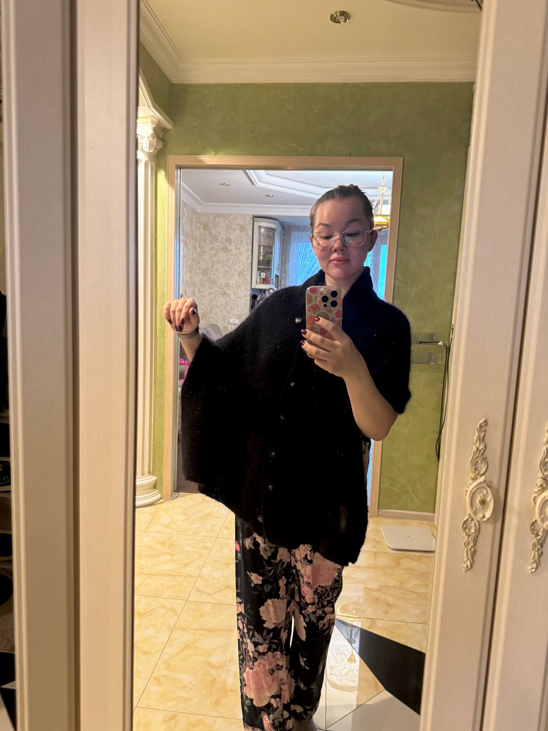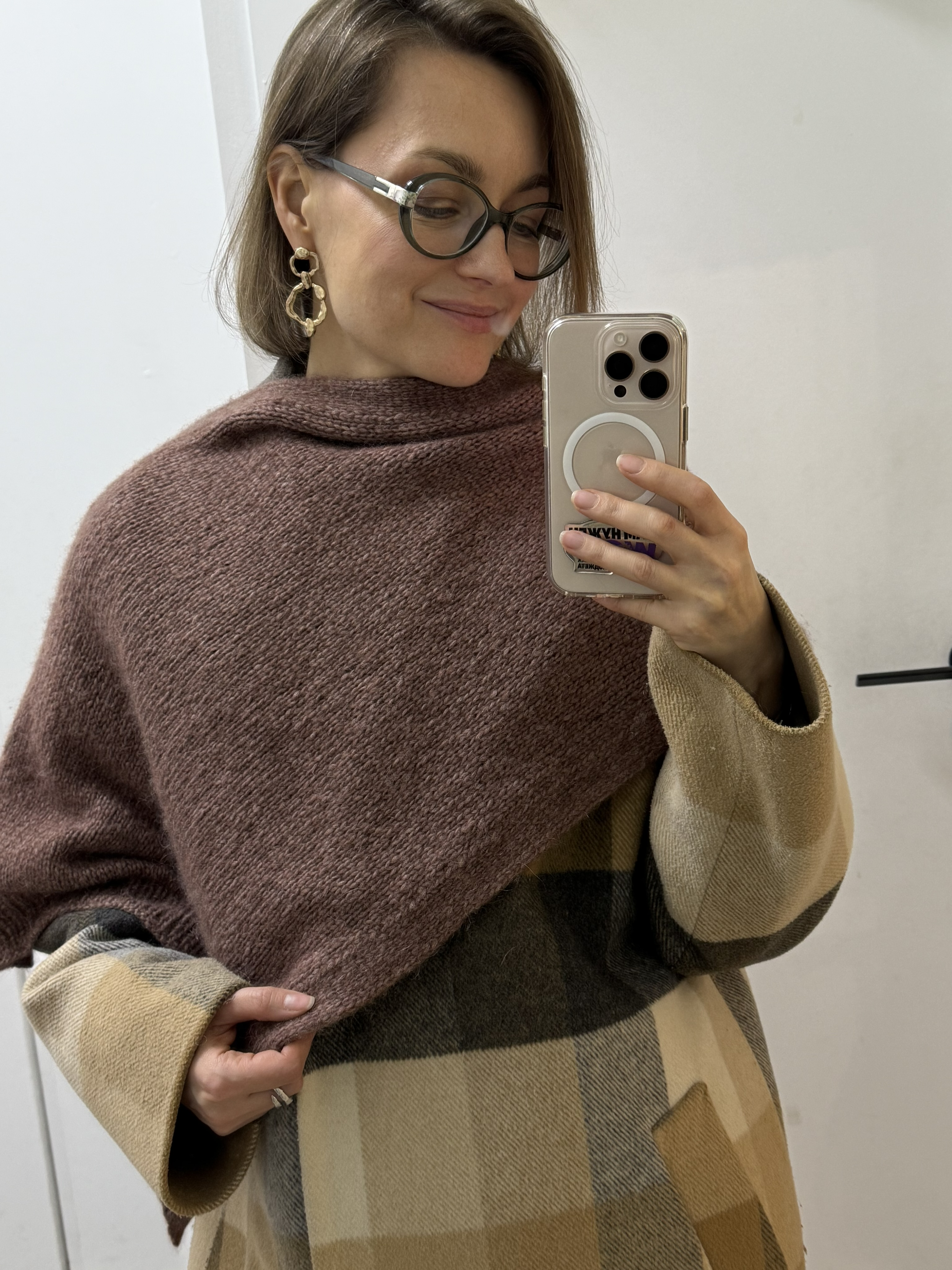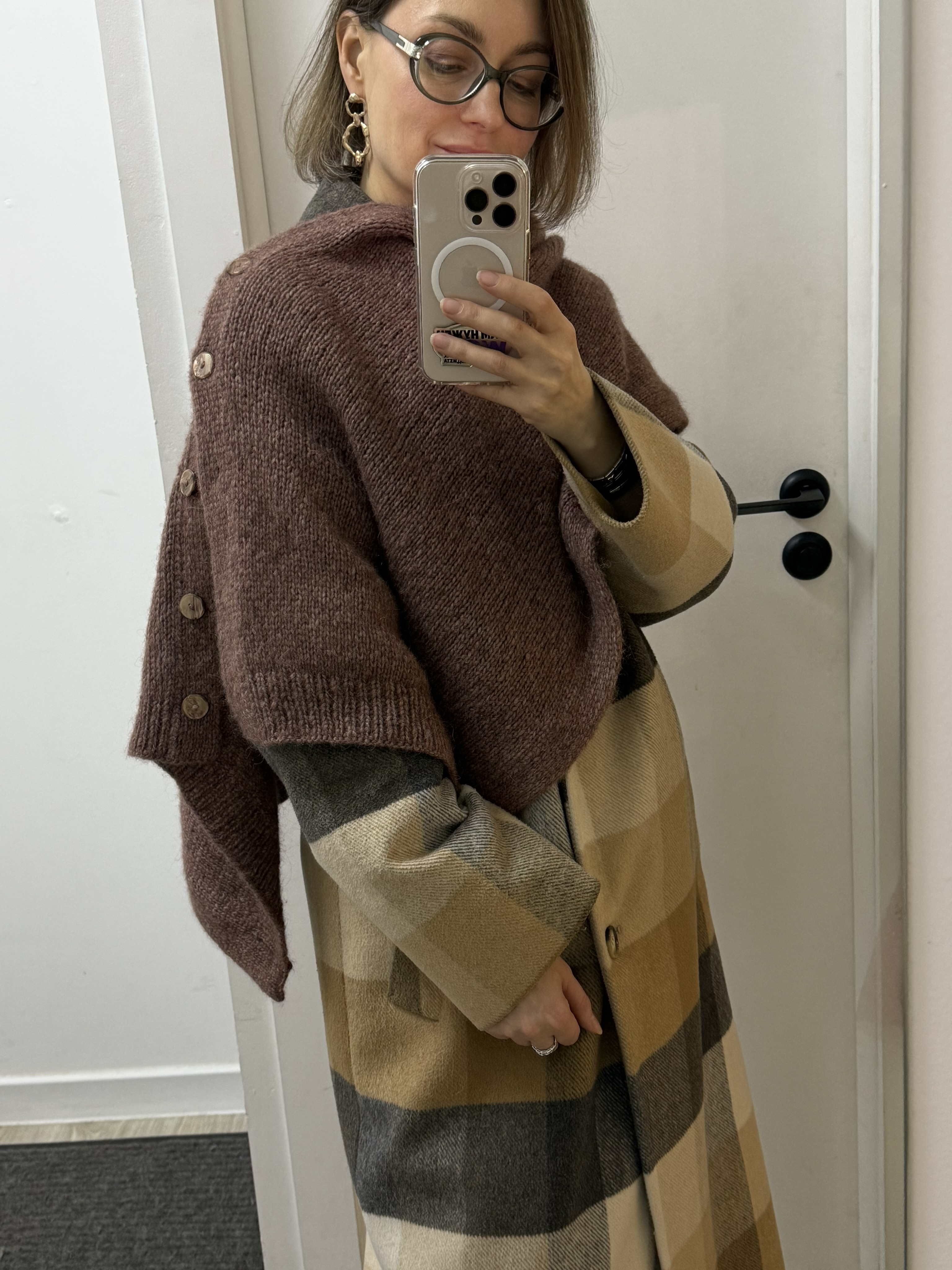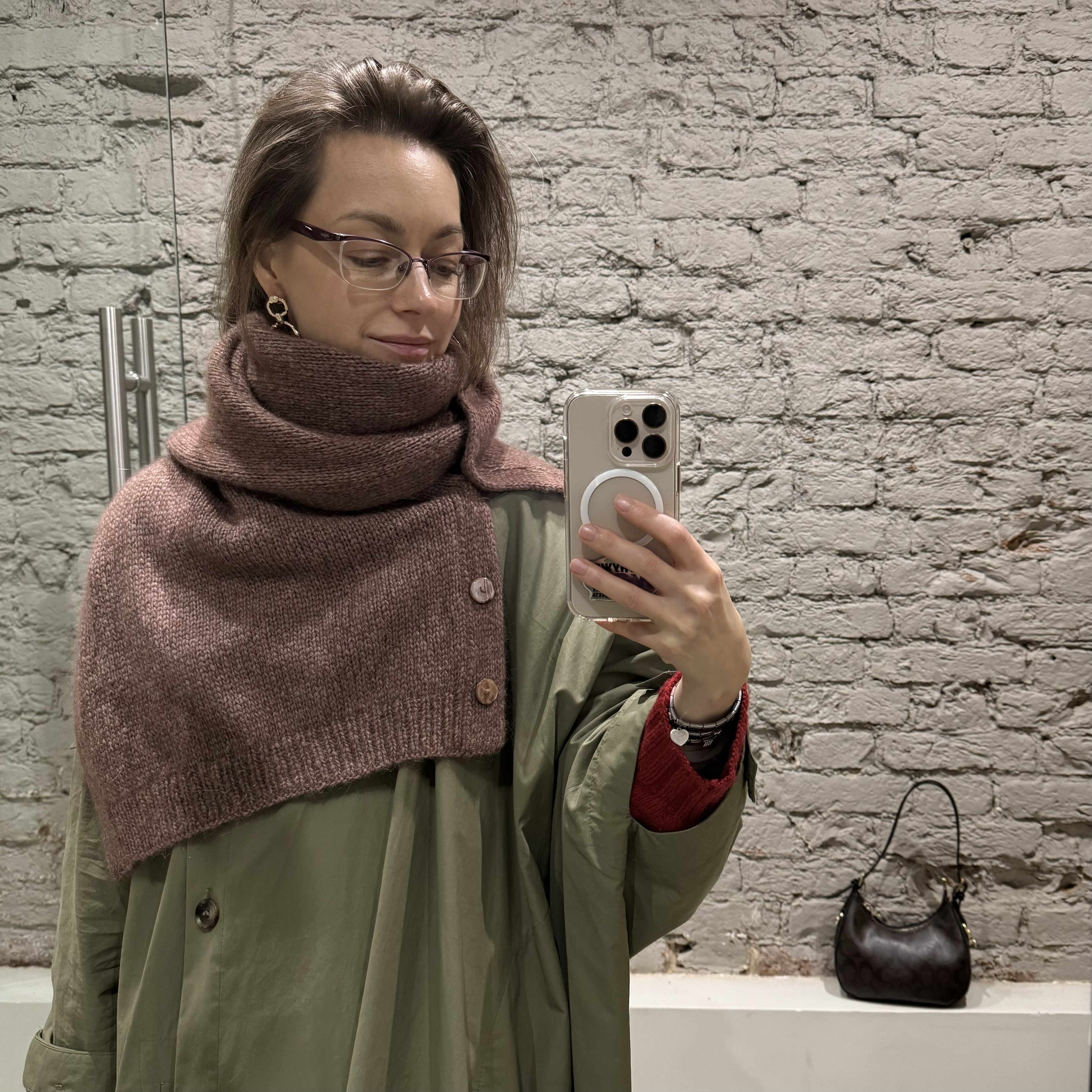 Шарфожилет коричнево-розового цвета связан из пряжи Kos, на него ушло 5 мотков при росте 162 см. Расход пряжи ~750 м. Если вы выше, рекомендуем взять еще 1 моток, чтобы получить достаточную длину изделия.