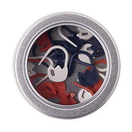 Набор включает 15 маркеров одного типа (либо сердечки, либо тюльпаны), которые помещены в жестяную коробочку.